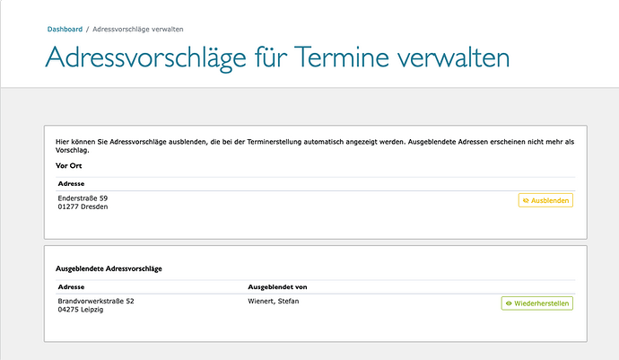 Bei der Terminerstellung werden automatisch Adressvorschläge angezeigt, die sich aus den am häufigsten verwendeten Adressen aller bisherigen Terminvereinbarungen ableiten. Bisher war es nicht möglich, veraltete oder fehlerhafte Adressen aus diesen Vorschlägen zu entfernen. Das führte in der Praxis dazu, dass Bewerbende Einladungen mit falschen Adressen erhielten, etwa wenn ein Standort umgezogen ist.