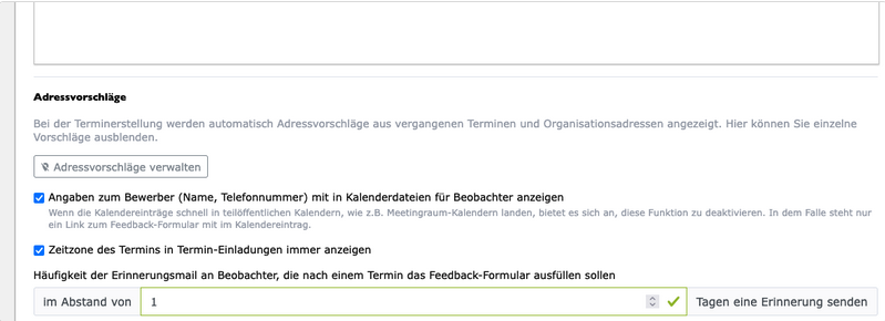 In den Einstellungen gibt es nun im Bereich "Termine" einen neuen Abschnitt "Adressvorschläge" mit einem erklärenden Hinweistext und einem Link zur Verwaltungsseite.