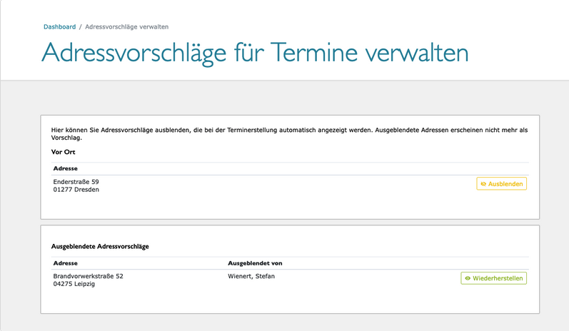 Auf der Verwaltungsseite werden alle aktuell aktiven Adressvorschläge aufgelistet, gruppiert nach Terminart (Vor Ort, Telefon, Video, Microsoft Teams). Einzelne Adressen lassen sich per Klick auf "Ausblenden" aus den Vorschlägen entfernen. Ausgeblendete Adressen werden separat aufgeführt und können jederzeit wiederhergestellt werden.