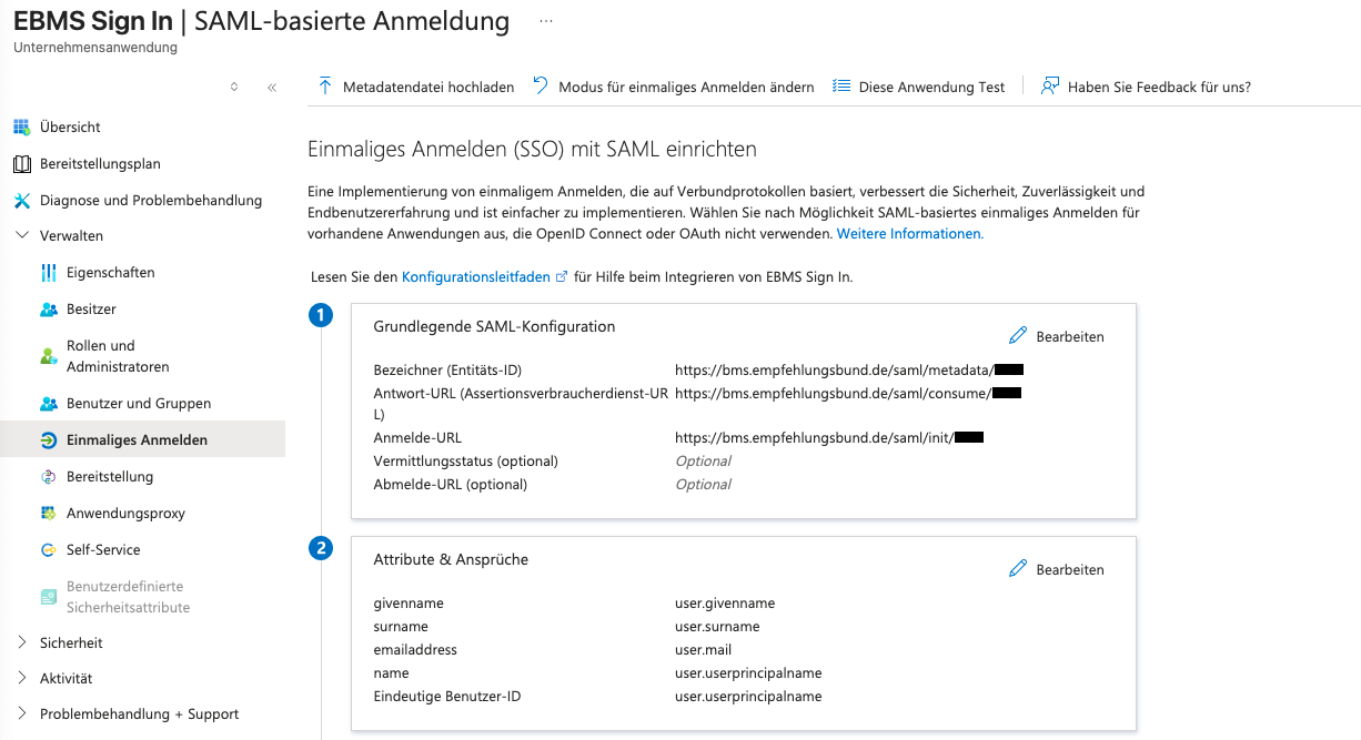 - In der Basic SAML Configuration tragen Sie im Abschnitt „Edit“ folgende Werte ein (die Sie von EBMS erhalten):
