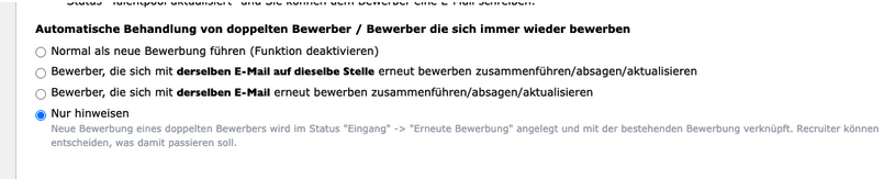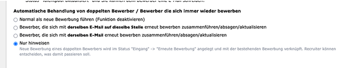Dies ist besonders hilfreich, wenn Sie bei erneuten Bewerbungen zunächst manuell prüfen möchten, wie mit dem Bewerber verfahren werden soll – beispielsweise bei Kandidaten, die ursprünglich über Personalvermittler eingegangen sind.