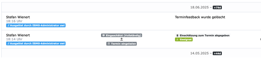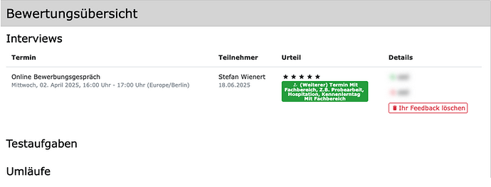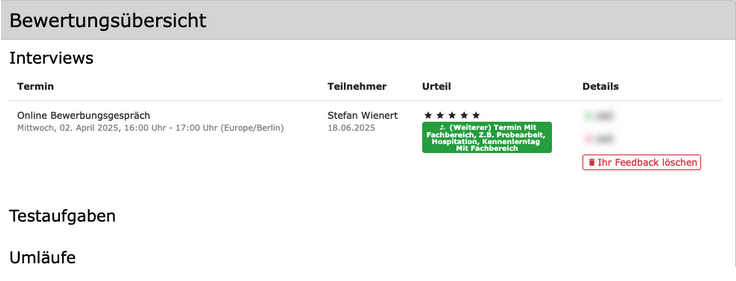 Beobachter:innen und Recruiter:innen können nun ihre eigenen Feedbacks löschen, solange die Feedbackphase noch nicht abgeschlossen ist. Falls Sie sich bei der Eingabe vertan haben, können Sie das Feedback entfernen und neu anlegen.