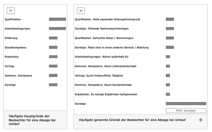 Die Statistik-Auswertung wurde um eine neue Ansicht erweitert: Sie können nun die Absagegründe auswerten, die von Beobachter:innen und Führungskräften bei Umläufen oder Terminbewertungen hinterlegt wurden.