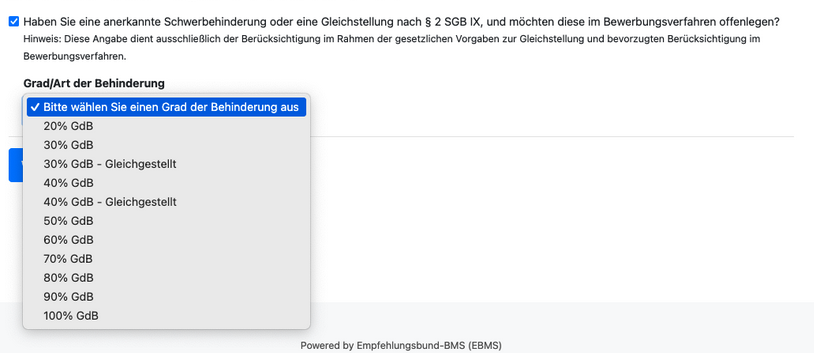 Schwerbehinderten Bewerber:innen bleibt es nach wie vor freigestellt, ob sie ihre Schwerbehinderung an dieser Stelle angeben.