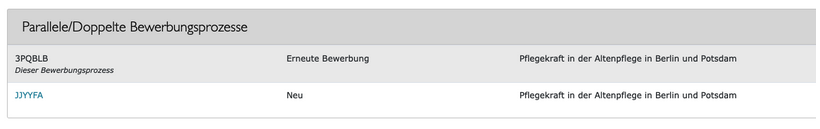 Außerdem werden bei diesen doppelten Bewerbungseingänge immer alle doppelten Prozesse oben rechts in der Akte angezeigt. Noch offene parallel Prozesse können dort leicht per Klick zusammengeführt (gemerged) werden.