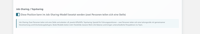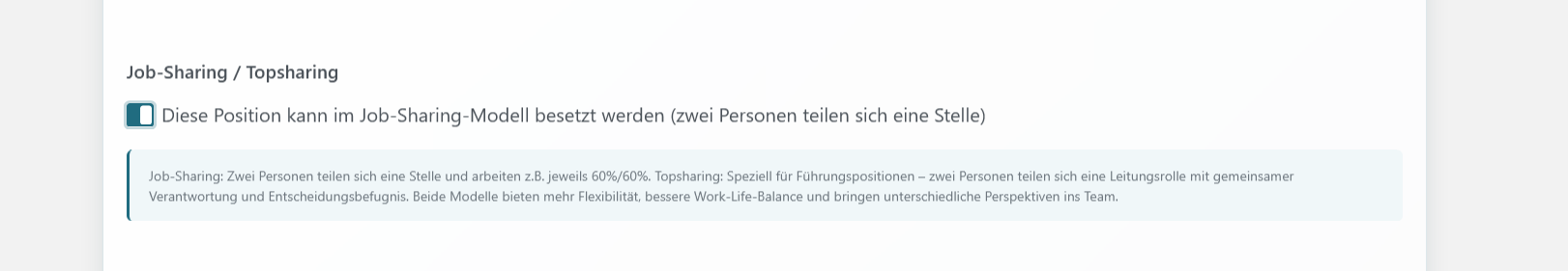 Stellenanzeigen können nun als Job-Sharing-fähig gekennzeichnet werden. Arbeitgeber haben damit die Möglichkeit, direkt im Stellenformular anzugeben, ob eine Position im Job-Sharing- oder Topsharing-Modell besetzt werden kann – also ob sich zwei Personen die Stelle teilen können.